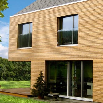 Im Zentrum steht ein glücklicher Kunde mit einem gesunden Holzbau.